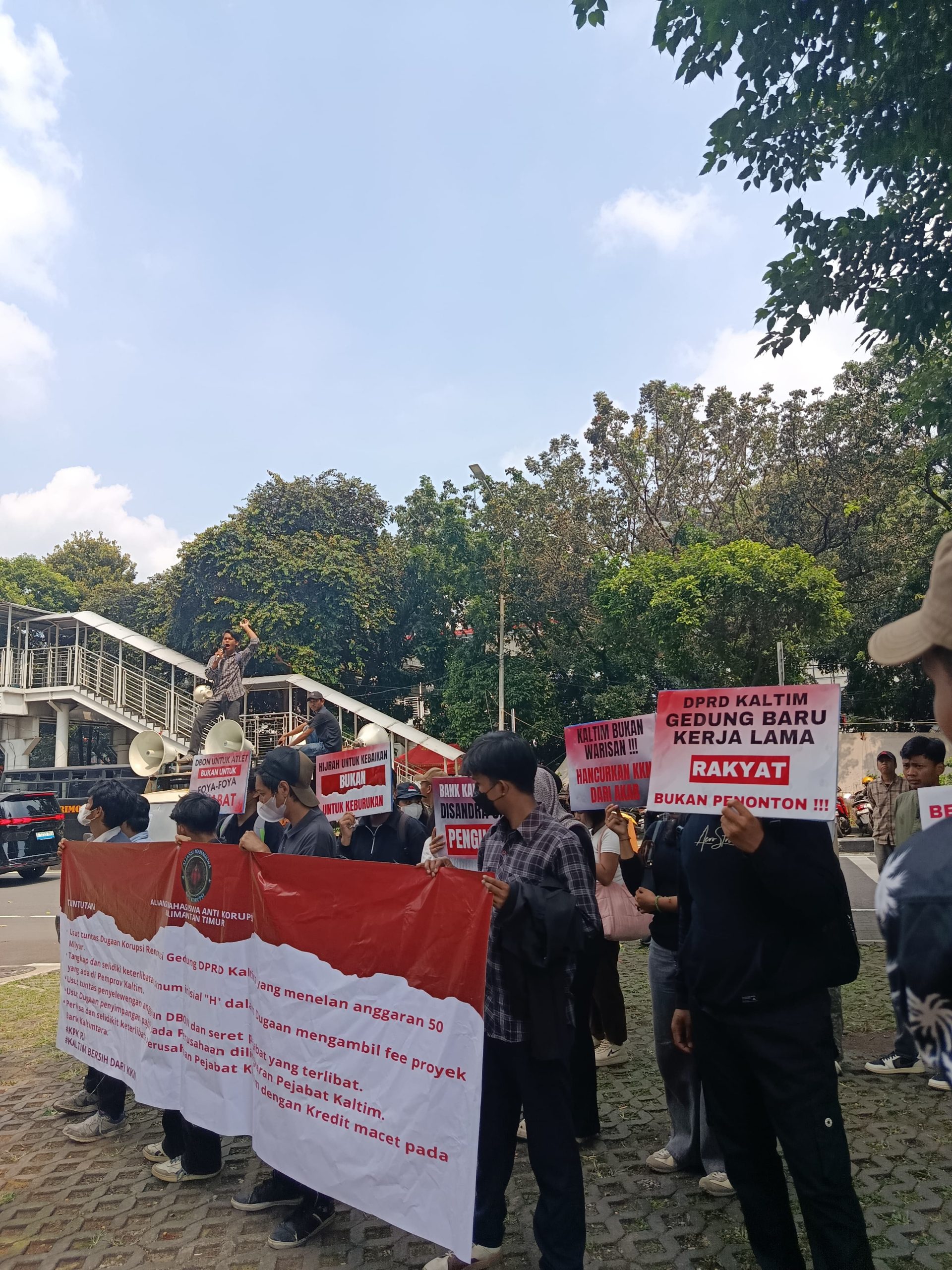 “KPK harus bergerak cepat, usut tuntas renovasi gedung DPRD dan seret siapa saja yang terlibat, termasuk oknum H,” ujarnya di depan massa.