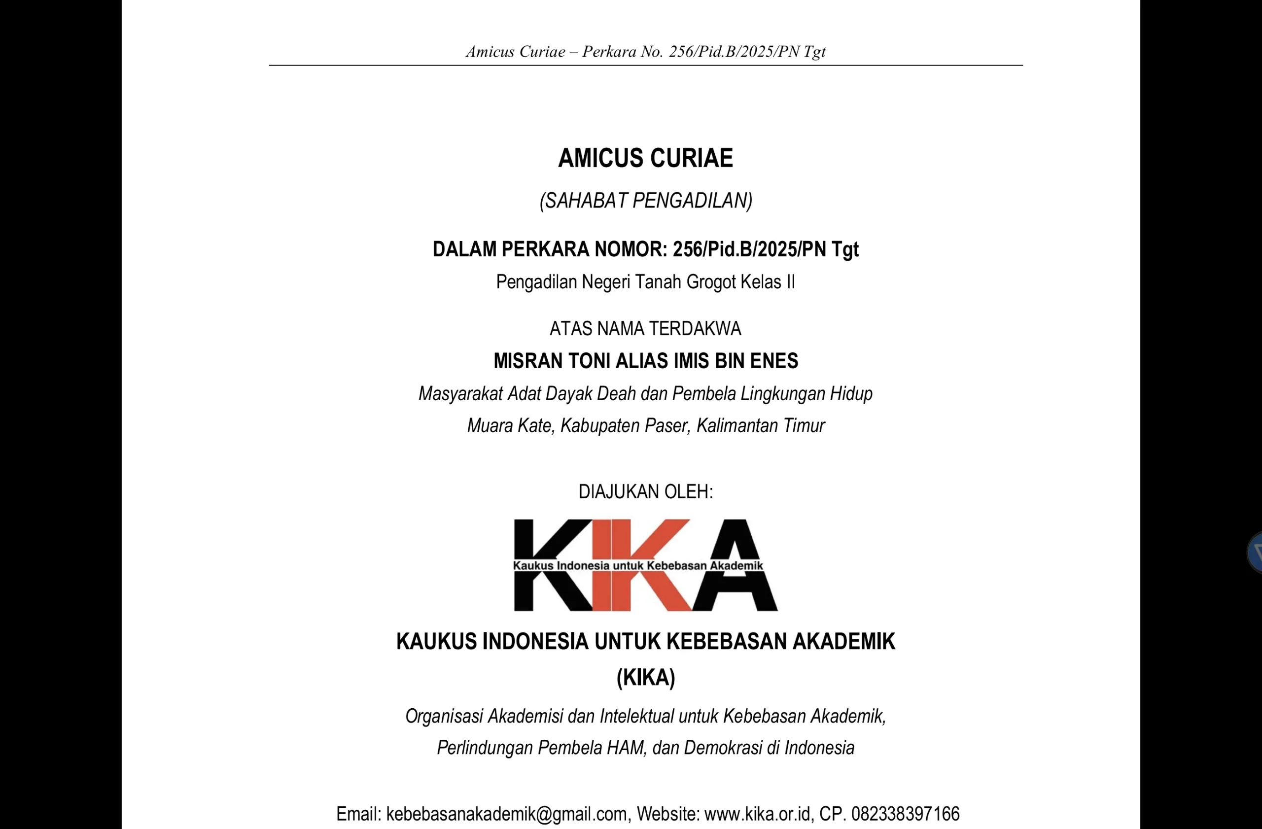 Tanah grogot, Sketsa.id – Kaukus Indonesia untuk Kebebasan Akademik (KIKA) resmi mengajukan diri sebagai amicus curiae atau sahabat pengadilan dalam perkara yang menjerat Misran Toni alias Imis, seorang tokoh masyarakat adat Dayak Deah asal Muara Kate, Kabupaten Paser. Dokumen setebal belasan halaman itu telah dilayangkan ke Pengadilan Negeri Tanah Grogot pada awal Maret 2026 sebagai bahan pertimbangan bagi majelis hakim yang menyidangkan perkara Nomor 256/Pid.B/2025/PN Tgt .