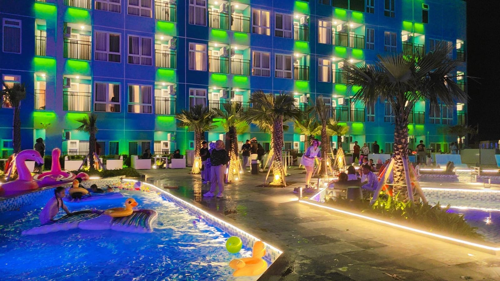 “Fasilitas kita ada tiga kolam renang, satu kolam renang dewasa, anak-anak dan ada kolam renang cilik atau untuk bersantai, karena ada tempat tidur dan tempat duduk di dalam kolam renang. Lalu kami ada gedung serbaguna yang bisa digunakan untuk pernikahan, jadi konsepnya on the boat atau kolam,” tuturnya.