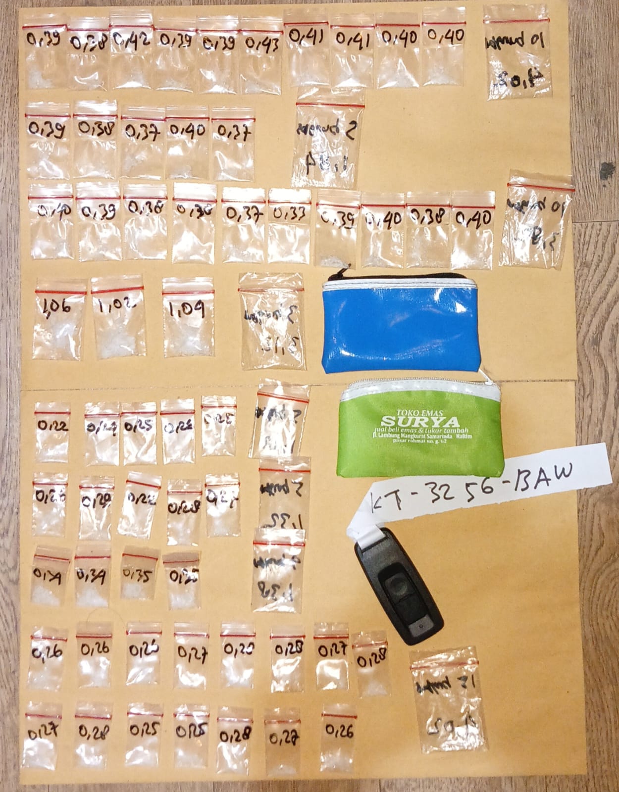 Polisi juga menemukan barang bukti didalam jok 1 unit kendaraan R2 warna hitam dengan yang sebelumnya dikendarai ANR (32) berupa 1 buah handbag warna hitam yang berisikan 1 buah dompet kecil warna hijau yang didalamnya terdapat lagi 5 bungkus/poket Narkotika jenis sabu seberat 1,22 (satu koma dua dua) Gram brutto yang terbungkus didalam 1 lembar plastik klip, 5 bungkus/poket Narkotika jenis sabu seberat 1,32 (satu koma tiga dua) Gram brutto yang terbungkus didalam 1 lembar plastik klip, 4 (empat) bungkus/poket Narkotika jenis sabu seberat 1,38 (satu koma tiga delapan) Gram brutto yang terbungkus didalam 1 lembar plastik klip, dan 15 (lima belas) bungkus/poket Narkotika jenis sabu seberat 4,02 (empat koma nol dua) Gram brutto yang terbungkus didalam 1 lembar plastik klip, beserta barang bukti lainnya.