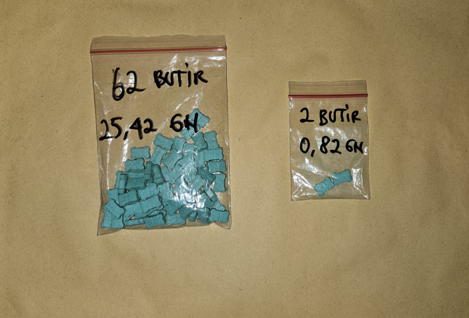 Saat digeledah di lokasi, polisi menemukan 62 butir pil ekstasi warna hijau dengan berat bersih 25,42 gram yang disimpan di kantong depan sebelah kanan celana tersangka. Selain itu, ditemukan pula dua butir ekstasi tambahan seberat 0,82 gram. Total keseluruhan barang bukti yang diamankan mencapai 64 butir dengan berat bersih 26,24 gram, dikemas dalam dua buah plastik klip.